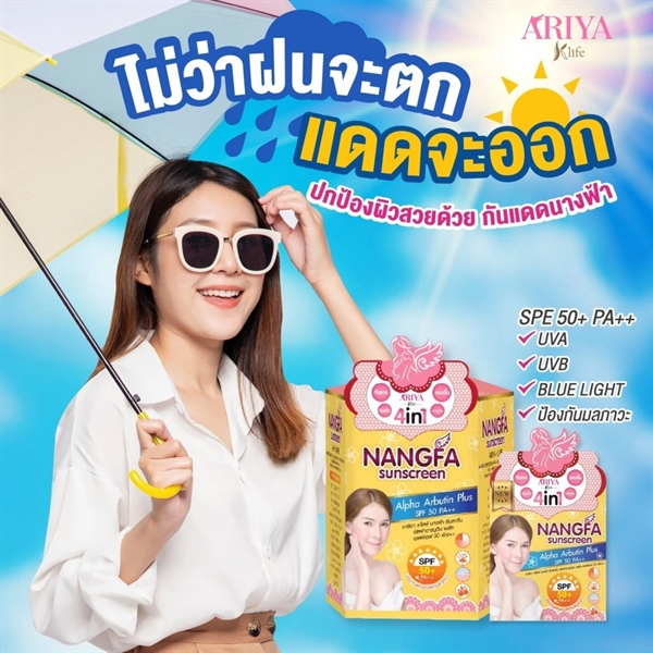 - Vừa là kem chống nắng, kem nền chống nắng, kem lót chống nắng, lại có tác dụng dưỡng trắng da, che khuyết điểm, hỗ trợ ngăn ngừa nám, sạm da, chống nhăn, chống lão hóa. Nó giúp da được giữ ẩm, kiểm soát dầu mà không làm da cảm thấy nhờn. Với những cô nàng bận rộn, chỉ cần 1 bước trang điểm với Kem chống nắng Nangfa Sunscreen SPF 50 Thái Lan 4in1 bạn có thể tự tin khi đi ra ngoài với thời tiết nắng nóng mà làn da lại luôn tươi trẻ, mịn màng.