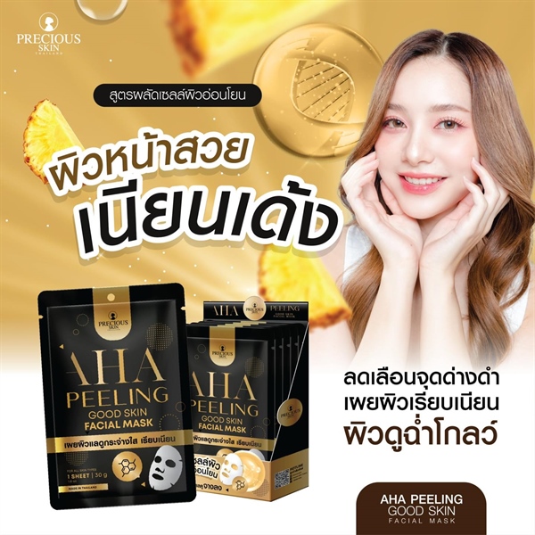 - AHA Peeling Good Skin là mạt nạ dưỡng da công thức tẩy tế bào chết nhẹ nhàng, kết hợp cùng chiết xuất từ 7 loại trái cây giúp tẩy tế bào chết và làm mờ vết xỉn màu, giúp làn trông rạng rỡ, mịn màng, vết thâm trông mờ dần, làn da được dưỡng ẩm, rạng rỡ và dịu dàng