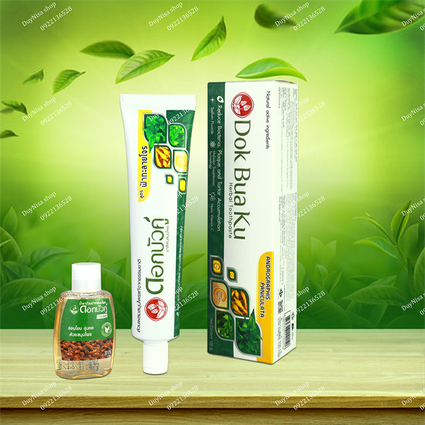 - Kem đánh răng thảo dược Dok Bua Ku chứa Andrographis Painculata, Artemisia Annua, chiết xuất Boesenbrgia Rotunda và các thành phần thảo dược có tác dụng làm giảm sự tích tu của vi khuẩn, mảng bám và cao răng hiệu quả, kết hợp từ lợi ít của Nano Vitamin C cùng công nghệ tiên tiến loại bỏ hôi miệng từ Nhật Bản cho nướu và răng chắc khỏe, chăm sóc răng miệng nhẹ nhàng, mang lại sự tin cả ngày.